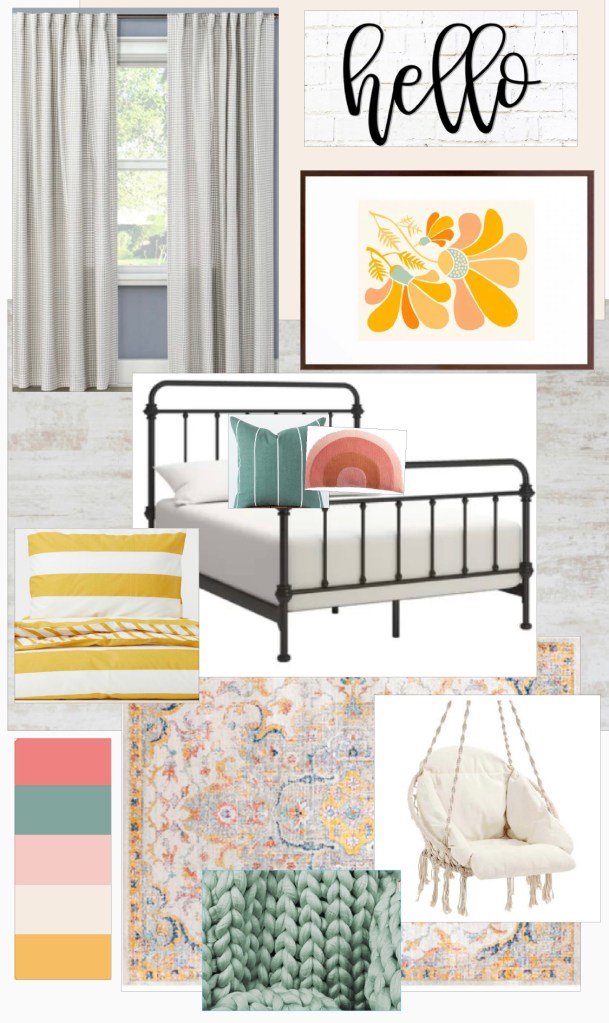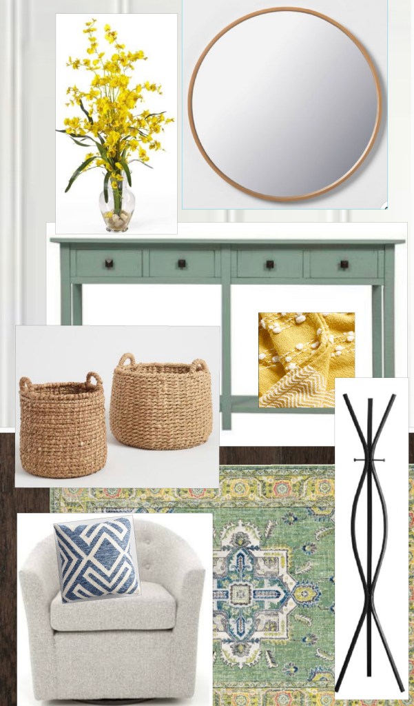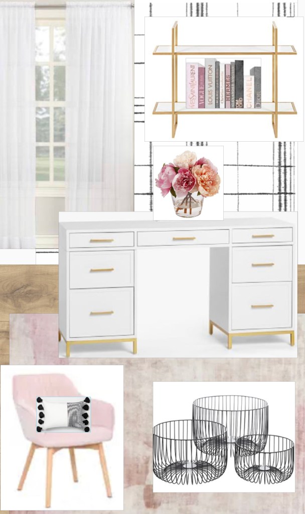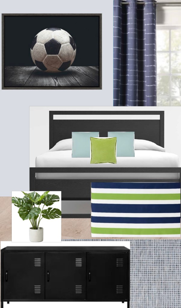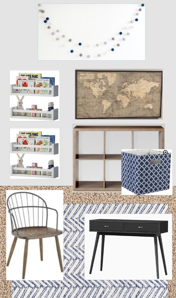 These design boards came as a result of my sisters sister-in-law needing ideas for her home office space. She already had a black desk and the cute map, but needed a way to tie the room together. It is also the only room in the home where the kids can play so I decided to design it in a way that it could also serve as a playroom. I designed it first using black and white accents and then converted it to blue tones as requested by the client.