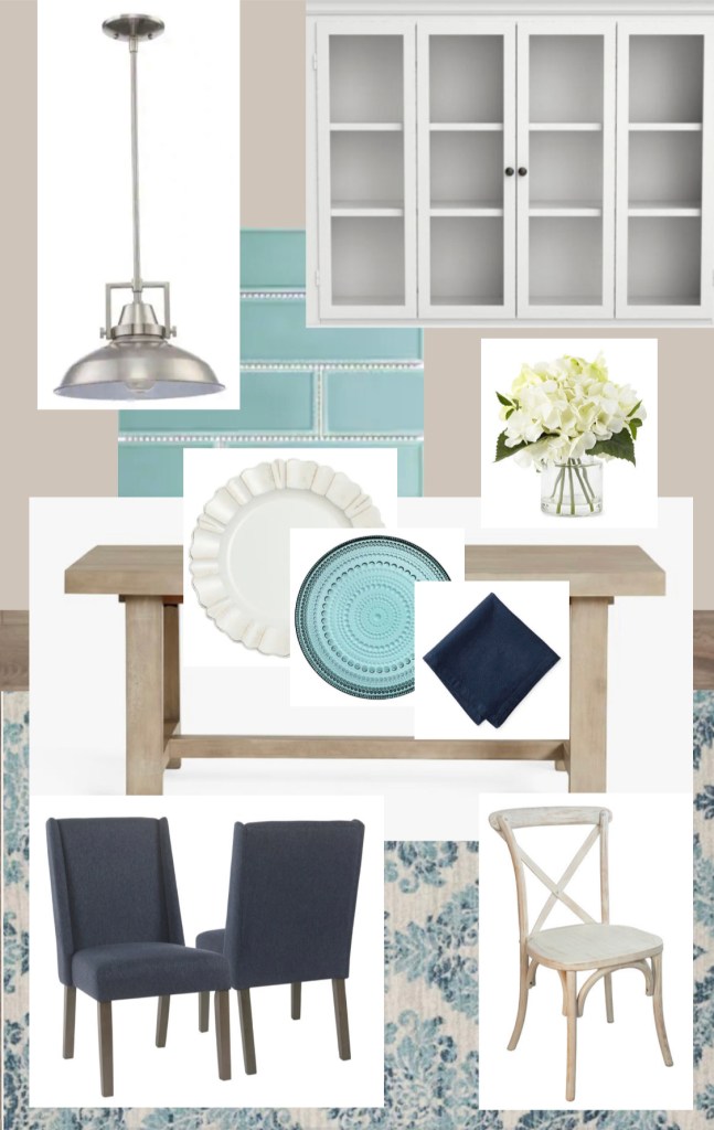 I think it would be really fun to get a gray wood table with slightly white washed chairs and two navy blue accent chairs to go at either end of the table. I love the idea to of getting a rug to put under your table that pulls the light blue of your backsplash along with navy. I would highlight your table with white floral stems and some thing similar to the table setting that I have pictured.