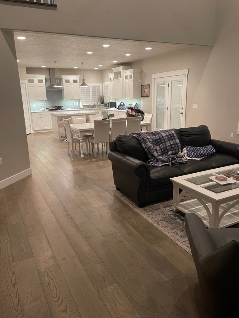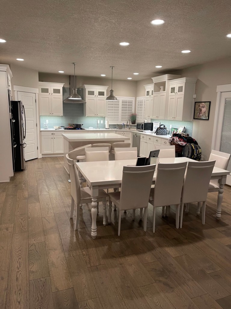 Barb is a tennis coach to some of my girls. She has not done a lot of decorating in her home yet but would love to get started with some inspiration and help. She wanted to start with a new kitchen table and needed some help to know what would look good with the different wood stains and colors in her home. These are the pictures she sent me: