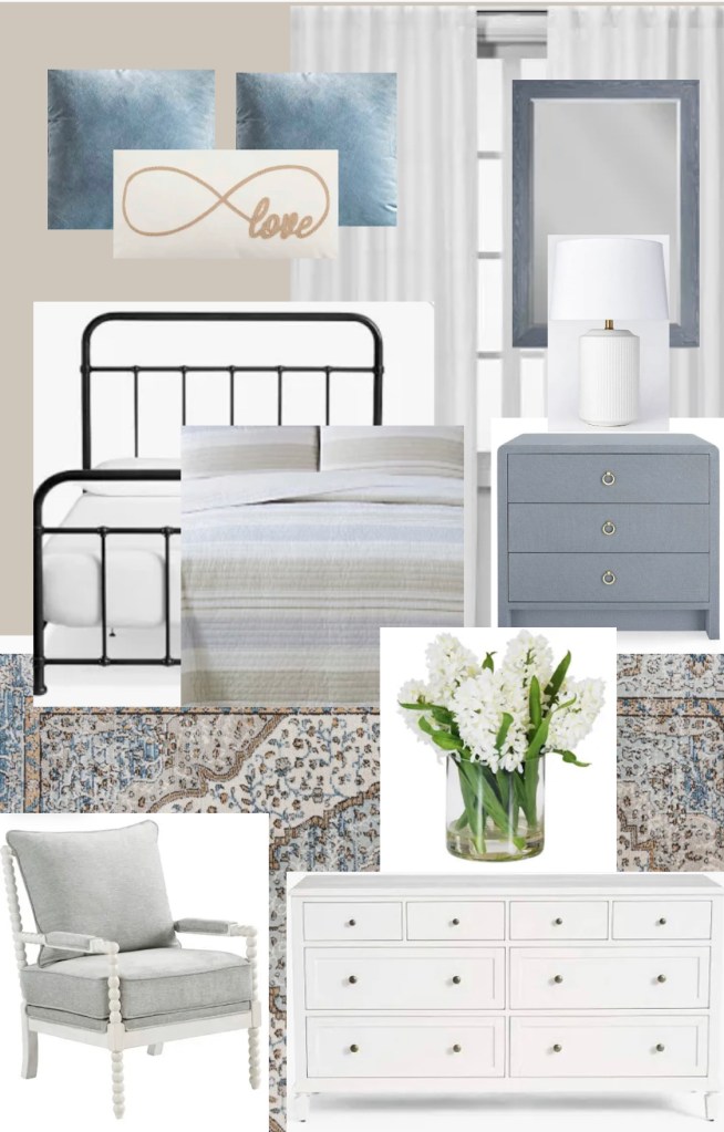 I think you could spray paint your bedframe black and then paint your nightstands this pretty steel blue and add gold hardware. Paint your dresser white and add black hardware. You could get a rug to put under your bed that would ground everything and add color. I really like working with blue because I feel like there are so many shades and you can add a lot of dimension by playing with different blues and grays together. Would it be possible to move your bed in front of the big window and frame the window with white curtains? That would really lighten up the room and add a focal point. It’s hard to tell from the pictures what the space is like in the room. Anyway, you could also paint your huge mirror the same pretty blue color as your nightstand. It would look cute to have that leaning up against the wall with a new chair sitting by it. For your bedding I would just get a white comforter with white sheets and then get a pretty quilt like the one pictured that has the right colors in it that you could fold and lay across the end of your bed. Then get throw colors pillows that pull out the blue white and tan colors. Always add greenery to your room, whether it is stems in a vase sitting on your dresser or a faux tree. You could also do a cute gallery wall.
