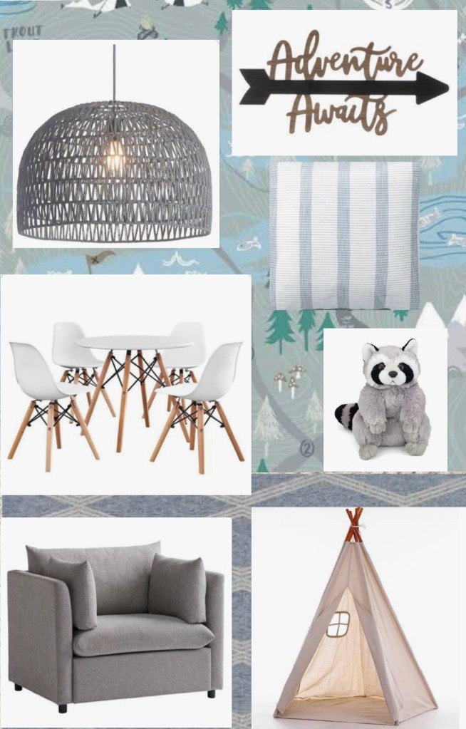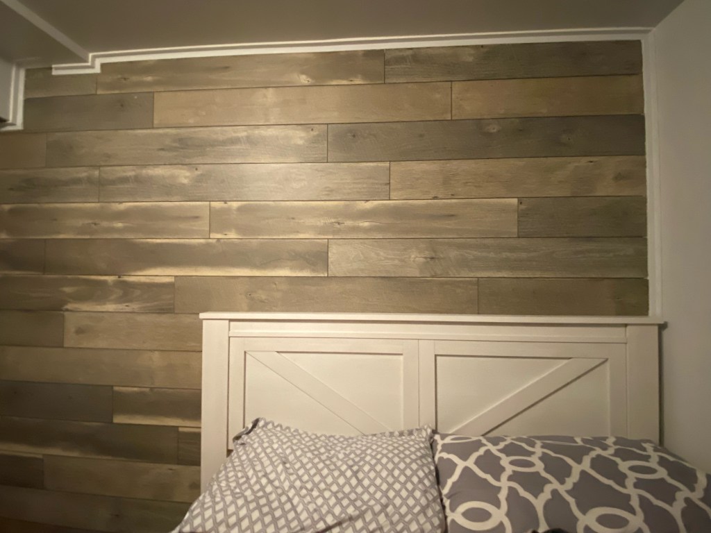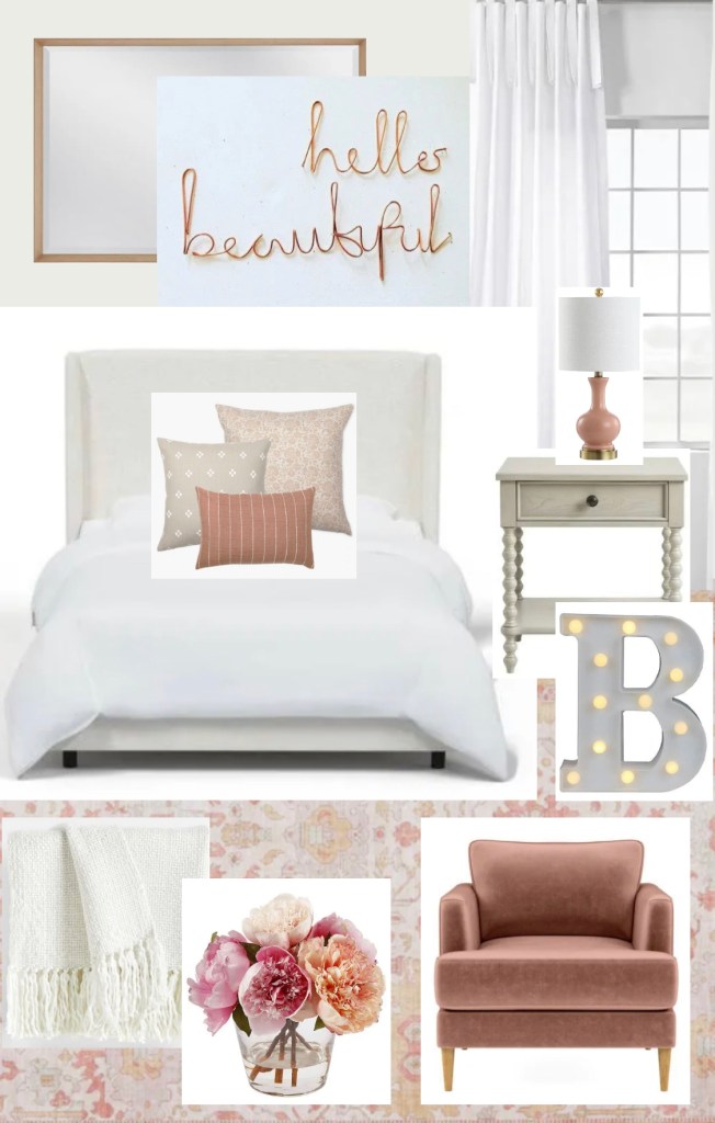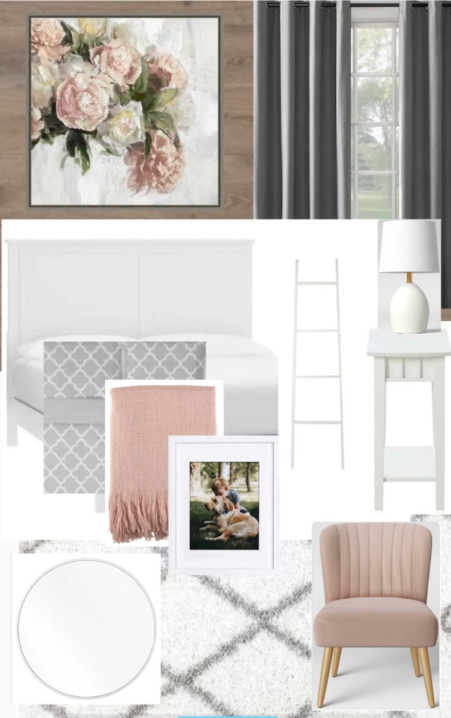 I have no idea if you like pink but I love how it looks with gray. I included some ideas of things that you could put on your wood wall. A cute white wall ladder that leans against the wall, a white mirror, wall art that pulls together the pink and gray. Those are a few ideas for you. I think it would be awesome to ground the room with a white and gray area rug. Also, I think it would be great to add a really small narrow bedside table that you can put a little lamp on. And if you have room a cute little pink accent chair would be adorable in the corner of your room!