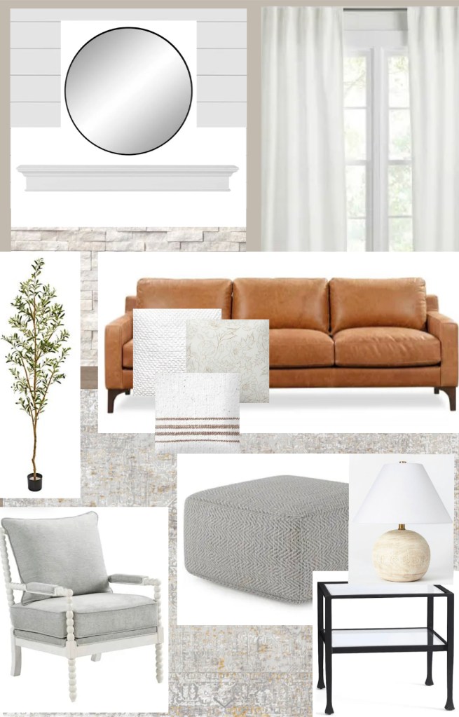 The rug is a lighter color with white grays and camel colors in it. I like the idea of painting the wood above your fireplace white and you could also white wash the brick/stone around it. I think you could keep the chairs you already have. It would be cute to get a textured ottoman like the one I have pictured. A round black metal mirror would look good above the fireplace and you could also do a glass/black metal end table. I included a faux tree in your design because it would be great to add greenery. Also, white curtains would really brighten up the room.
