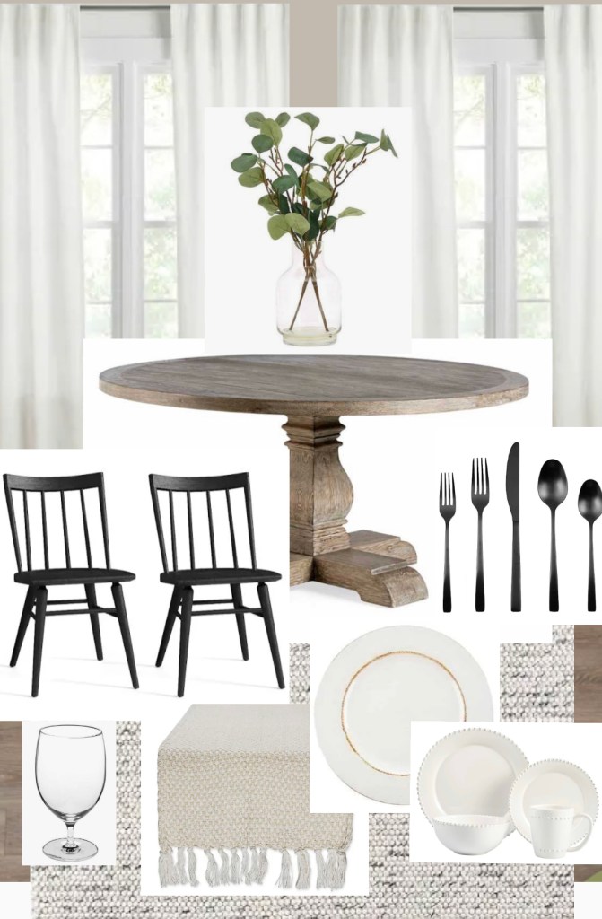 It seems like you have the space that you could maybe do a round table. I would also add white curtains on those windows that are in that area that would match the curtains in your family room. I went with a neutral woven rug for under the table. I think a gray/natural wood table would look great highlighted with some black dining chairs. It’s amazing how just adding a rug really grounds the room and can pull everything together.