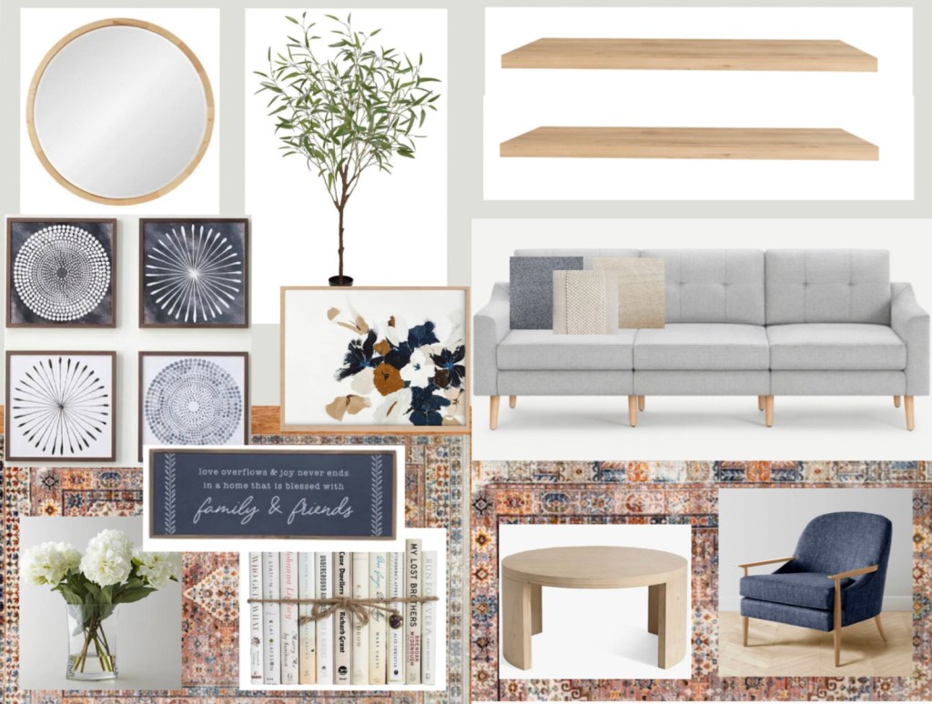 My adorable niece Jessie and her husband recently purchased and will soon be moving into her childhood home in Virginia! They want to get a head start on ordering furniture, etc. so that it can all be ready to go when they arrive after their long trip across the country, so Jessie asked if I could help her out. She said, “In my current house, I went very bohemian with lots of colors (think opal house brand meets world market) and I liked the funkiness of it, but it also started to wear on me. I like the clean feel of Joanna farmhouse, but don’t like the lack of color. I’m hoping to stick a balance of bohemian/farmhouse with soothing, airy colors (like sage green, or calming teals/grays) I also want it to feel light and open! I traditionally like mid-century modern furniture (like this sofa https://www.article.com/product/2974/timber-rain-cloud-gray-corner-sectional) but am open to leather, other colors/styles, etc! I’m thinking I’ll need something large scale on the wall to anchor the room, and I don’t want to do a TV over the fireplace. I’m in no rush and I know you’re busy, so don’t feel ANY pressure whatsoever!! I’m just so grateful to get a talented expert helping me!!!” She already had several rugs in mind that she was interested in so I based my design on the rug that I liked best from the options she sent. This is the picture that she sent me: