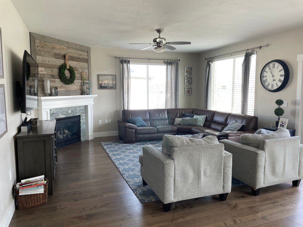 I would probably get two couches and four chairs for your room. You could have the gray couches facing each other with a set of chairs on each end. And possibly a round coffee table in the middle. I would do long floating shelves above your couch on that big open wall and style them with layered art and other decor. Above your fireplace I would set a round mirror like the one pictured. I know that is a corner but I think it would probably work to just set a round mirror on the fireplace and then you could style some greenery or other decor as well. I would keep it very simple though. Another option would be to just remove the fireplace if possible. I have put some examples of artwork, a faux tree, books and other ideas that you could use for styling.