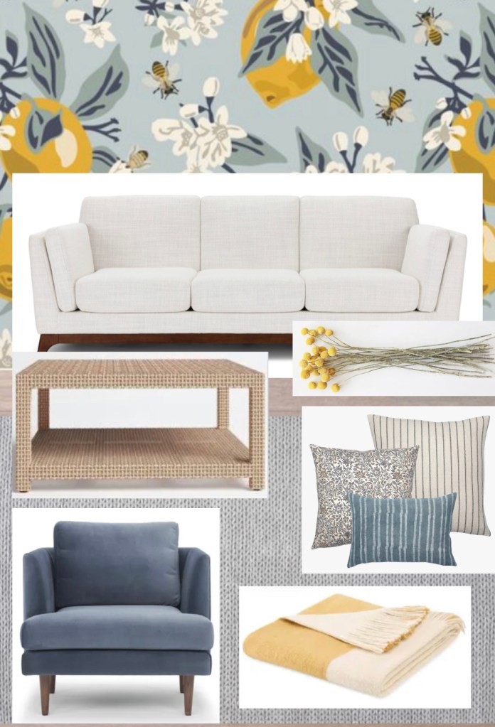 I discovered the most adorable wallpaper a few days ago and decided that it needed to be used in a living room design. I hope you all like it as much as I do!