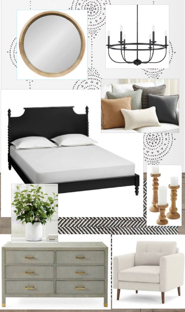 Twill Indigo Master Bedroom Luna Stripe Wallpaper: http://serenaandlily.comHerringbone Black Woven Cotton Rug: http://annieselke.comBlack Wood Cottage Platform Bed: http://worldmarket.comTwill Indigo Throw Pillows: http://ballarddesigns.comKate and Laurel Hutton Mirror in Natural: http://bedbathandbeyond.comBalboa Dresser: http://serenaandlily.comBurrow Modular Armchair: http://burrow.comCapital Lihjting Fixture Company: http://bellacor.comLeafy Green Plant: http://grandinroad.comCarmel Rattan Candlestick: http://serenaandlily.com Share this: Share on X (Opens in new window) X More Share on Facebook (Opens in new window) Facebook Share on Pinterest (Opens in new window) Pinterest Like Loading...