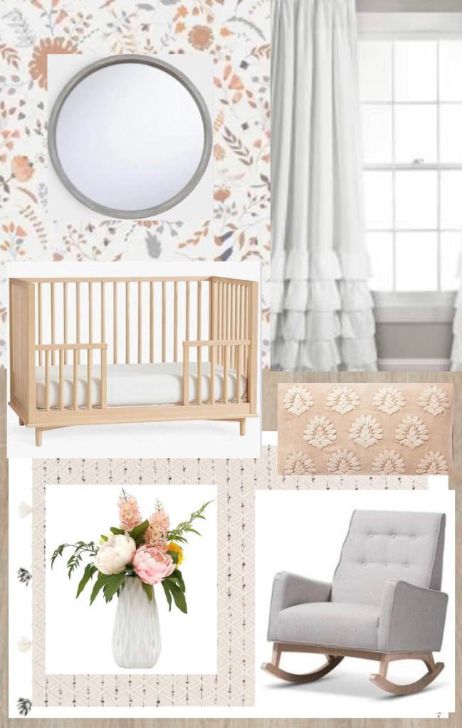 Alexis Baby Nursery Alexis Removable Wallpaper: http://wayfair.comCrema Oak Laminate Flooring: http://lowes.comSadleir Area Rug: http://botiquerugs.comLush Decor Allison Ruffle Curtains: http://overstock.comNash Toddler Bed: http://westelm.comBaxton Studio Marlena Rocking Chair: http://walmart.comMiramonte Pillow Cover: http://serenaandlily.comRound Rustic Gray Mirror: http://worldmarket.comSonoma Goods for Life Artificial Mixed Floral Arrangement: http://kohls.com Share this: Share on X (Opens in new window) X More Share on Facebook (Opens in new window) Facebook Share on Pinterest (Opens in new window) Pinterest Like Loading...