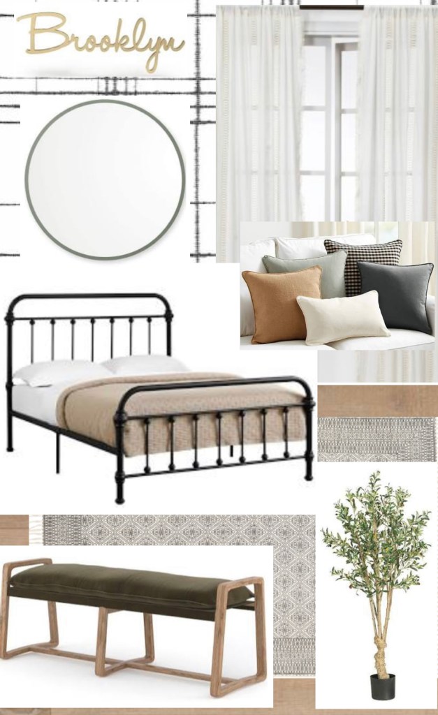Brooklyn Bedroom AquaGuard Rustic Timber Floors: http://flooranddecor.comLynwood Farmhouse Plaid Wallpaper: http://overstock.comLace Trim Light Filtering Curtain Panel: http://target.comMonarch Specialties Full Bed: http://macys.comAce Bench: http://burkedecor.comBetter Bevel Sage Green Mirror: http://amazon.comEssential Throw Pillow Cover Twill Indigo: http://ballarddesigns.comBrooklyn Sign: http://48hourmonogram.comFaux Olive Tree: http://potterybarn.com Share this: Share on X (Opens in new window) X More Share on Facebook (Opens in new window) Facebook Share on Pinterest (Opens in new window) Pinterest Like Loading...